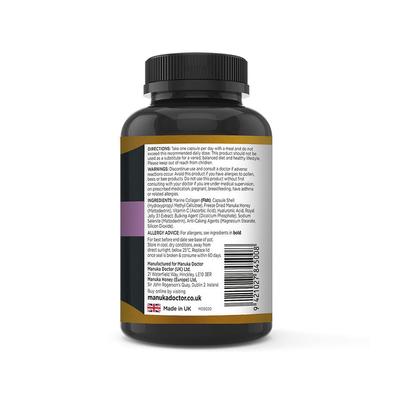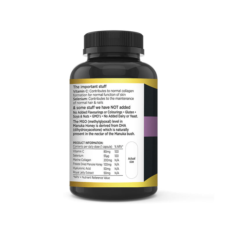 Collagène marin (poisson), enveloppe de la gélule (hydroxypropylméthylcellulose), miel de Manuka lyophilisé (maltodextrine), vitamine C (acide ascorbique), acide hyaluronique, extrait de gelée royale 3:1, agent de charge (phosphate dicalcique), sélénite de sodium (maltodextrine), antiagglomérants (stéarate de magnésium, dioxyde de silicium).