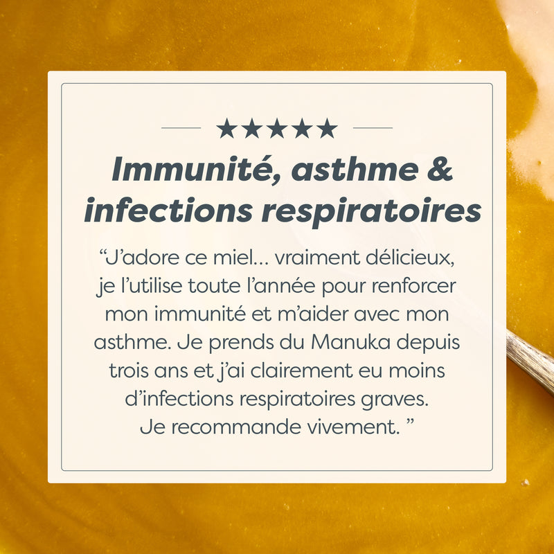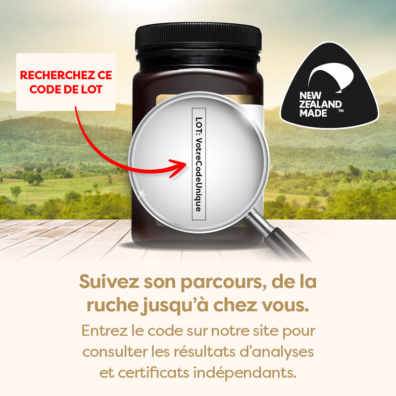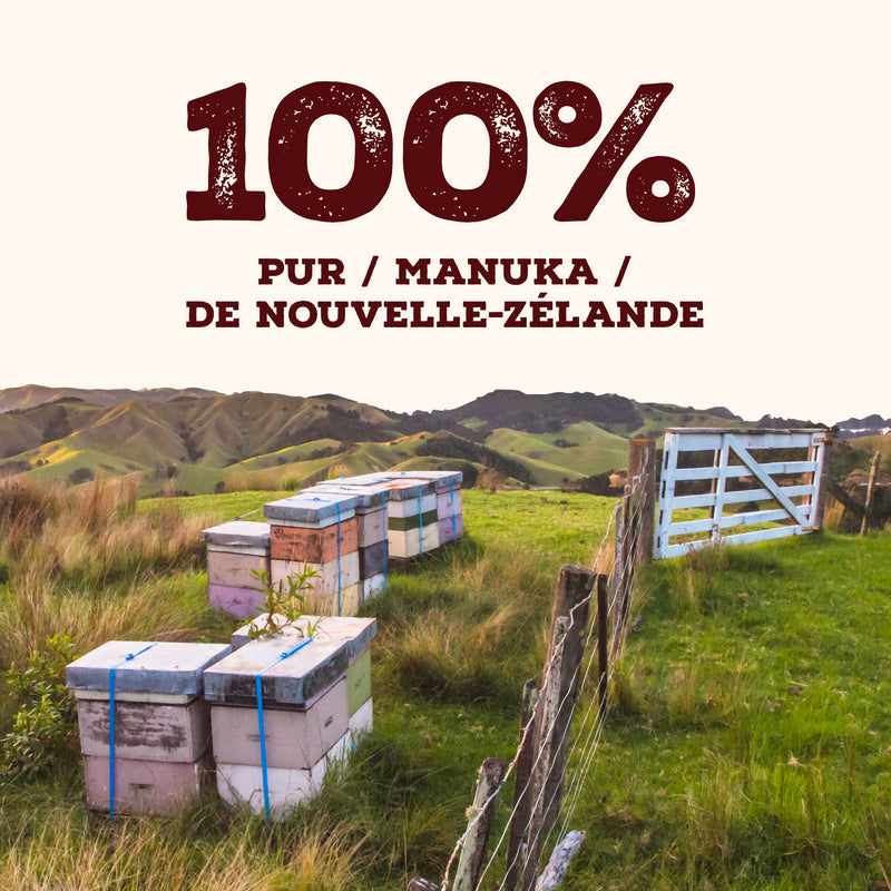Miel de Manuka 100 % authentique de Nouvelle-Zélande. Testé de manière indépendante pour montrer qu’il répond à la définition du miel de Manuka du gouvernement néo-zélandais.