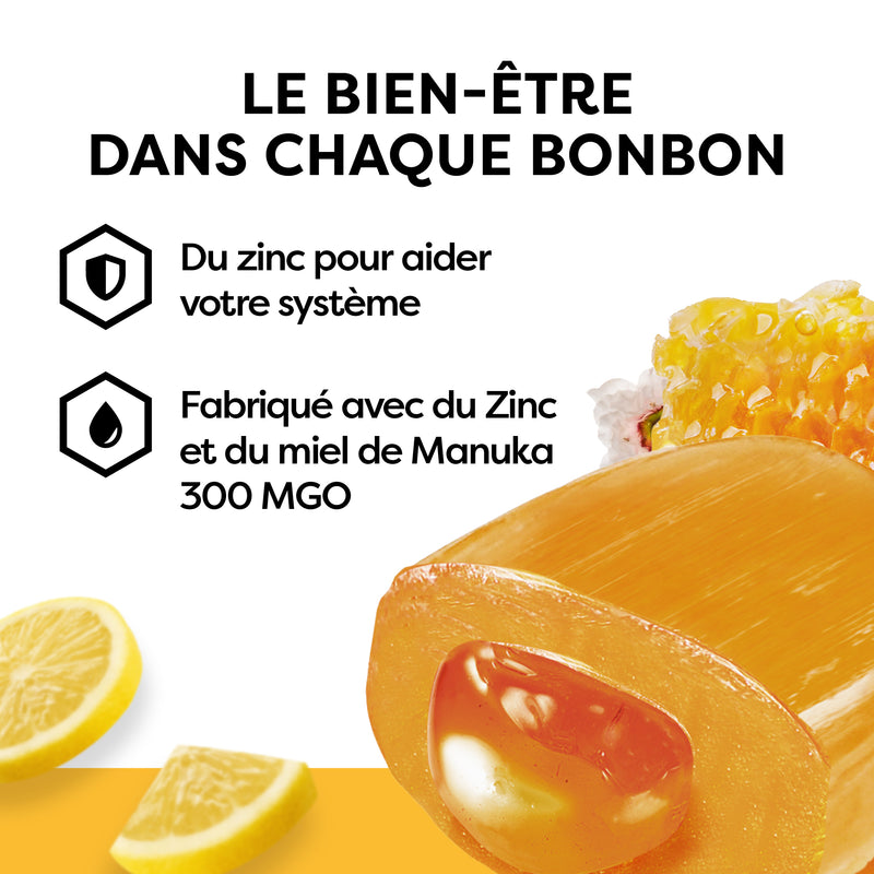 Sucre, Sirop de Glucose, Miel de Manuka (9%), Acidifiant (Acide Citrique), Huile de citron, Sulfate de zinc, Concentrés de jus de plantes colorantes (Carotte, Potiron).